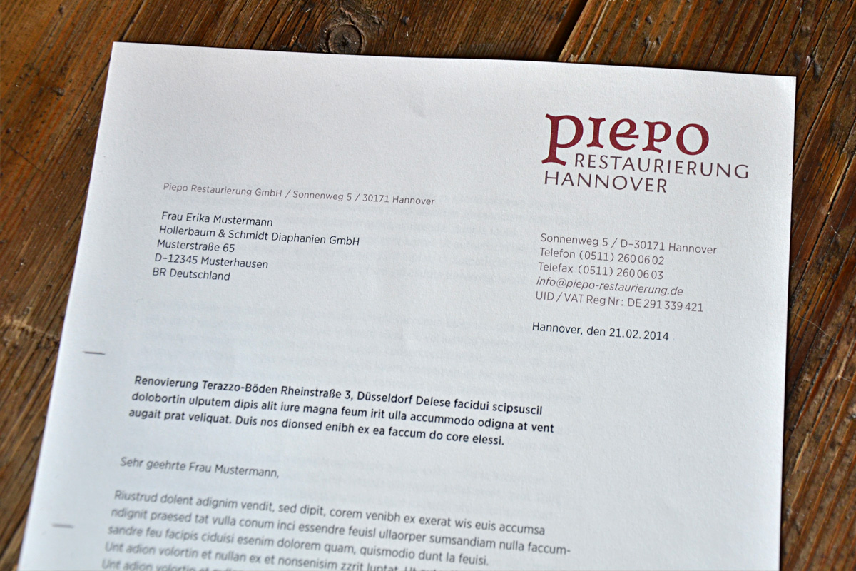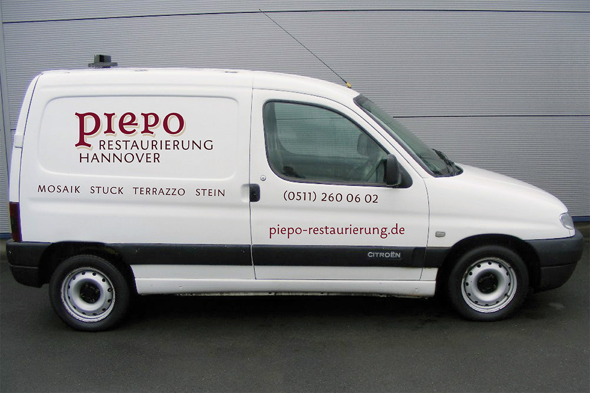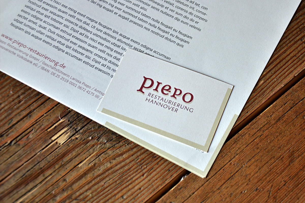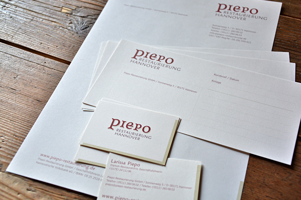 Erscheinungsbild Piepo Restaurierung. Studio LetterinBerlin Albertoni & Grögel, Berlin. Auftraggeber Piepo Restaurierung, Hannover.