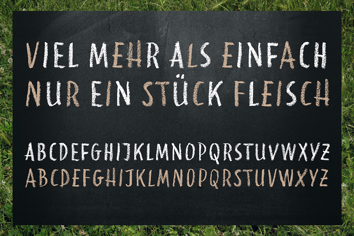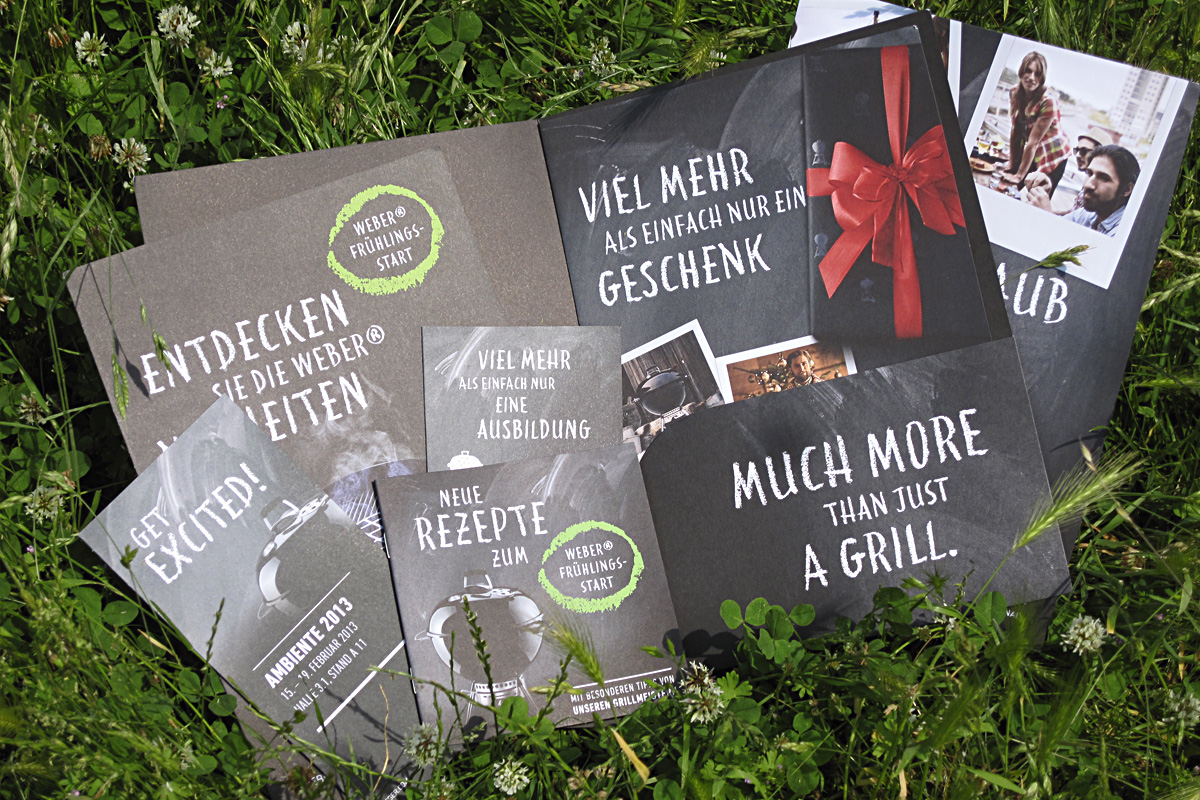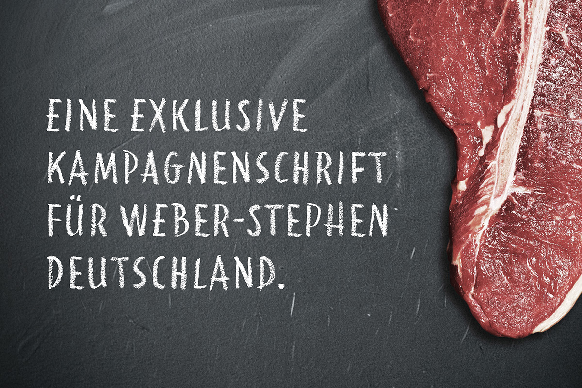 Für eine Kampagne von Fuenfwerken Design für Weber-Stephen Deutschland trugen wir die Schrift Weber Chalk bei. Die zu zeichnende Schrift sollte rein aus Großbuchstaben bestehen, eine schmale Laufweite und einen »roughen«, unperfekten Charakter besitzen. Ganz entscheidend für Weber Chalk sollte sein, dass die Schrift gerade in großen Größen über 10 Zentimeter Buchstabenhöhe einen feinen Kreide-Charakter bewahrt. Gerade diese Eigenschaft fehlt den verfügbaren Kreide-Fonts, die für den Einsatz in kleineren Größen gemacht sind. Um den handschriftlichen Charakter von Weber Chalk weiter zu steigern, entschieden wir uns dafür, jeden Buchstaben in zwei Varianten zu zeichnen. Durch den Wechsel zwischen Groß- und »Klein«-Buchstaben kann das Schriftbild belebt werden. Wir zeichneten alle benötigten Zeichen für einen europaweiten Einsatz der Schrift. Wir erstellten insgesamt drei Fonts für die drei Schriftsysteme Lateinisch, Kyrillisch und Griechisch.