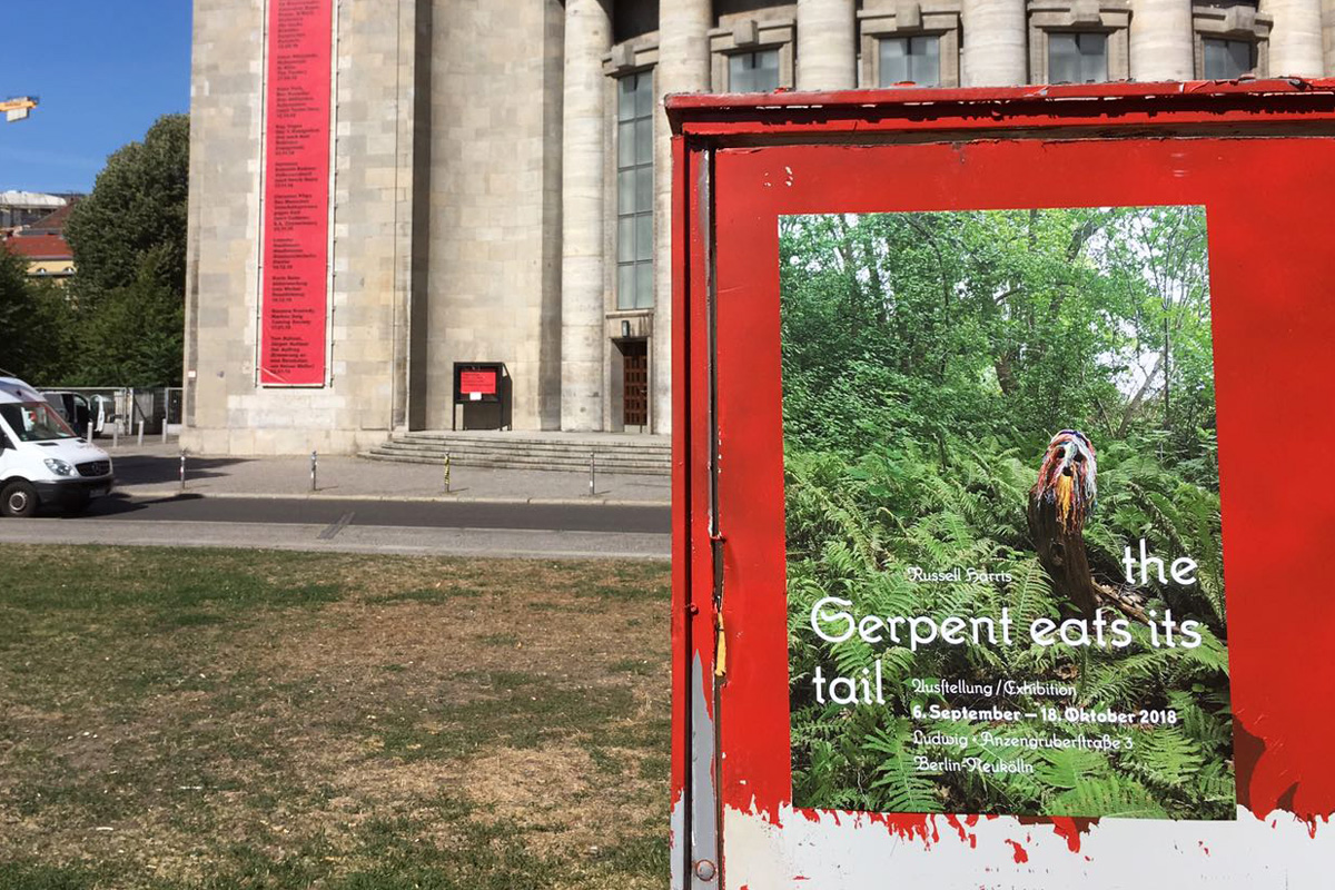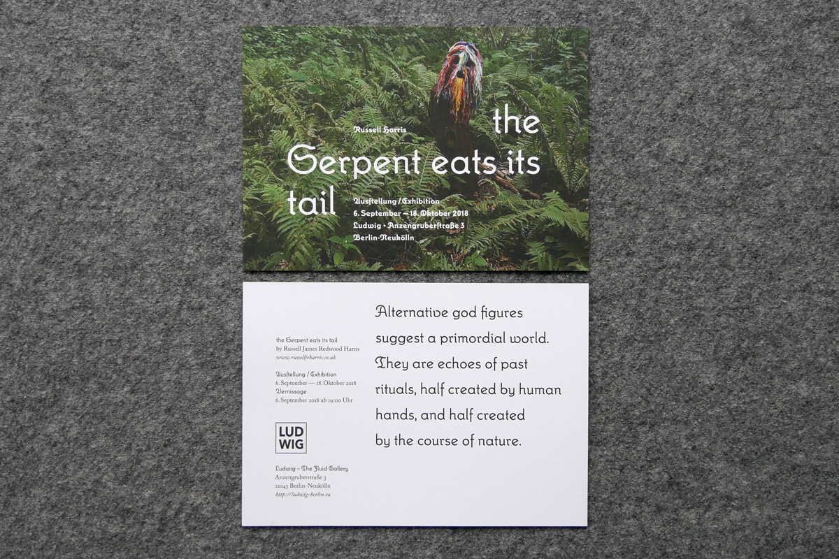 Plakat und Flyer zur ersten Soloshow von Russell James Redwood Harris. The Serpent Eats Its Tail widmet sich alternativen Gottheiten und alchemistischen Schöpfungsakten. …