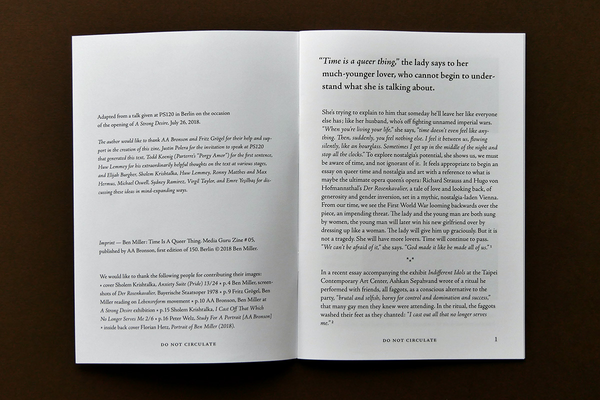 2018 begann AA Bronson eine neue Serie von Media Guru Zines, für die ich die grafische Gestaltung übernehmen darf. Die Zines sind inhaltlich sehr offen konzipiert. Manche Titel werfen ein Licht auf das Werk anderer Künstler, andere reflektieren Funde aus den Bereichen queerer Emanzipation oder spiritueller Praxis. Die einzelne Auflage umfasst typischer Weise zwischen 16 und 24 Seiten und ist stets auf 150 nummerierte Exemplare beschränkt. Zu sehen und zu erwerben auf Kunstbuchmessen!